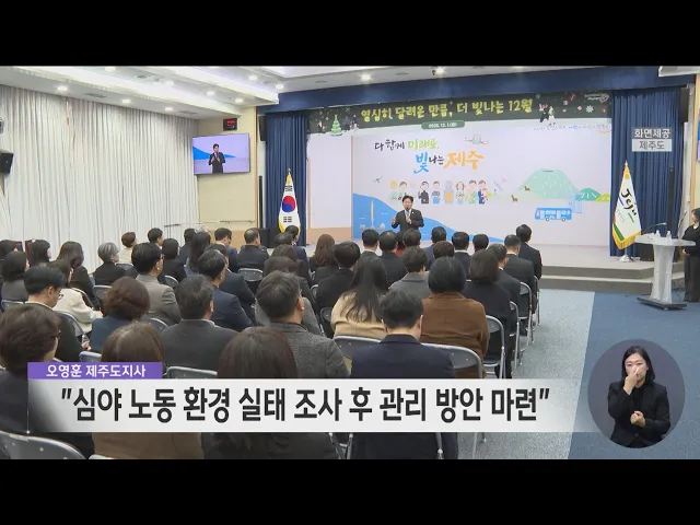 뉴스데스크 뉴스데스크뉴스투데이기획뉴스유튜브 뉴스페이스북 뉴스 prev 2025.12.1 - 월요일 next 예산안 심의 본격‥지방채·칭다오 항로 쟁점 ◀ 앵 커 ▶7조 7천억 원 규모의새해 제주도 본 예산안에 대한 제주도의회 예산결산특별위원회 심의가 시작됐습니다.회의 첫날, 역대 최대 규모의 지방채 발행 계획과 칭다오 항로 투자심사가 쟁점이 됐습니... 홍수현 "칭다오 화물선 책임 회피·도민 기만 중단해야" 더불어민주당원 등으로 구성된국민주권 도민행복 실천본부는 성명을 내고칭다오 화물선 사업의 투자심사를 누락한 오영훈 도정은 책임 회피와 도민 기만을 중단하고 사죄하라고 촉구했습니다.이들은 지방... 이따끔 제주산 한우·돼지고기 싱가포르 첫 수출 한국과 싱가포르 정상회담 합의 한 달만에제주산 한우와 돼지고기가 싱가포르에 첫 수출됐습니다.오늘(1일) 제주항에서 열린제주산 한우와 돼지고기 첫 싱가포르 수출 선적식에서 참석자들은 홍콩에 이어 ... 홍수현 "1분 넘으면 딱지"‥제주공항 주정차 단속 강화 ◀ 앵 커 ▶제주공항 도착 대합실 앞 도로는가족이나 일행을 태우려는 차들이 몰려늘 혼잡하고 사고 우려도 높은데요.그동안 CCTV로 단속을 벌여 5분 이상 세우면 과태료를 부과했는데, 이마저도 효과가 떨... 박현주 AI 기반 학교급식 조리로봇 전국 최초 도입 제주도교육청이 전국에서 처음으로인공지능 기반의 조리로봇을 도입했습니다.도입된 조리로봇은 지난 9월 22일부터 제주여자상업고등학교 조시실에서 튀김과 볶음, 면 삶기 등을 하고 있으며,인공지능이 ... 김항섭 "심야 노동 환경 실태 조사 후 관리 방안 마련" 쿠팡 새벽배송 택배기사의 사망 사고를 계기로 제주도가 심야 노동 실태를 전수 조사합니다.오영훈 제주도지사는12월 소통과 공감의 날 행사에서노동권익센터를 중심으로심야 노동환경 근무실태와 사업장 ... 이따끔 협박·스토킹에 위치추적까지‥검찰 송치 ◀ 앵 커 ▶제주도체육회 레슬링협회 임원이 지도자 지망생이나 지도자들에게 갑질을 하고, 개인 미행까지 시켰다는 소식 전해드렸는데요.이 임원이 여성 협박과 스토킹뿐만 아니라, 위치 추적까지 한 혐의... 박주연 고액 체납자 가택수색‥명품 가방 등 47점 압류 제주도가 지방세 고액 체납자 가택을 수색해체납액을 강제 징수했습니다.제주도는지난달 20일부터 사흘 동안천만 원 이상 고액 체납자 9명의 가택을 수색해명품 가방과 귀금속 등 47점을 압류했습니다.또 ... 이따끔 남방큰돌고래 춘삼이 세 번째 출산 추정 제주도 앞바다에 방류됐던남방큰돌고래 춘삼이가 세 번째 출산을 한 것으로 추정됩니다.다큐제주는 지난달 12일제주시 구좌읍 종달리 앞바다에서춘삼이가 태어난 지 얼마 되지 않은 새끼 돌고래와 함께 헤... 김항섭 제주남방큰돌고래 보호구역 내 낚시·선박관광 금지하라 환경보호단체 등이 남방큰돌고래 보호구역의위법 행위 중단을 촉구했습니다.해양환경단체 핫핑크돌핀스 등은제주도의회에서 기자회견을 열고 대정읍 신도리 앞바다가해양생물보호구역으로 지정됐지만선박 ... 이따끔 희망 2026 나눔캠페인 시작‥43억원 모금 목표 연말연시를 맞아 어려운 이웃을 위해 성금을 모금하는 희망 2026 나눔 캠페인이 시작됐습니다.제주사회복지공동모금회가 주최하는캠페인은 내년 1월 31일까지 진행되며목표 금액인 43억의 1%를 채울 때마... 조인호 감귤 밭떼기 사기·도난 사건 잇따라 감귤 수확철을 맞아 밭떼기 거래 사기와 도난 사건이 잇따르고 있습니다.서귀포경찰서는 서귀포시 표선면과 성산읍 일대의감귤밭 주인인 것처럼 속여상인들에게 밭떼기 거래로 팔아6억 원을 챙긴 혐의로 4... 조인호 평화로에서 목재 실은 트럭 전복‥1명 다쳐 오늘 오전 9시 반쯤 제주시 애월읍 제주운전면허시험장 근처 평화로에서목재를 싣고 달리던 1.5톤이 전복됐습니다.트럭이 교량 가드레일을 들이받으면서 40대 운전자가 다쳤고 목재가 도로에 쏟아지면서지... 조인호 임성철 소방장 2주기 메모리얼 트레일러닝 고 임성철 소방장 2주기를 맞아메모리얼 트레일러닝행사가 열렸습니다.제주소방 트레일러닝 동호회는표선 119센터에서 제주국립호국원까지 55킬로미터를 달린 뒤, 임성철 소방장의 묘역을 참배했습니다.임... 조인호