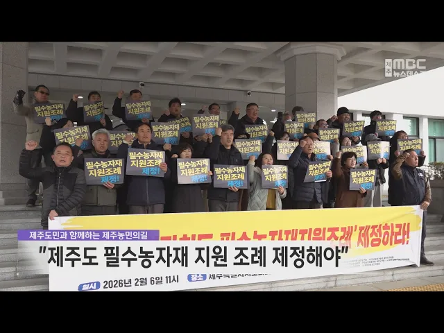 뉴스데스크 뉴스데스크뉴스투데이기획뉴스유튜브 뉴스페이스북 뉴스 prev 2026.2.7 - 토요일 next 활어차에서 불 시작‥기포 발생기 원인? ◀ 앵 커 ▶전남 목포로 향하던 화물선에서 불이 나 선박이 제주로 급히 돌아오고배에 타고 있던 4명이 다쳤는데요.물고기를 싣고 있던 활어차에서 불이 시작됐는데, 수조에 공기를 넣어주는 기포 발생기의... 김찬년 밤부터 많은 눈‥해안에도 내일까지 최고 15cm 제주산지와 남부중산간에 대설주의보가 내려진 가운데 밤부터 해안에도 많은 눈이 내리겠습니다.한라산에는 사제비 동산에는오늘 하루 6cm를 비롯해산지에는 5cm가 넘는 눈이 쌓여한라산 탐방로 출입이 모... 김찬년 위성곤 참여 제주사회대전환 미래포럼 창립 위성곤 민주당 국회의원이 참여하는제주사회 대전환을 위한 미래포럼이 오늘(7일) 출범했습니다.위성곤 의원이 고문으로 참여하는 미래포럼은 인공지능을 기반으로 하는 혁신과 에너지 대전환, 기본사회 ... 김찬년 제주청년참여기구 출범‥청년들이 정책 만든다 청년들이 정책 제안에 직접 참여할 수 있는제주 청년 참여 기구가 출범했습니다.제주4.3평화공원에서 발대식을 연제주청년참여기구는 10개 분과에 86명의 청년 위원들로 꾸려졌습니다.이들은 앞으로 분과... 김찬년 가격 하락 제주 당근 3천 톤 출하 정지 가격 하락으로 어려움을 겪고 있는제주산 당근이3천 톤 정도 시장에서 격리됩니다.제주농산물수급관리연합회는 올해 당근 생산량이 평년보다 5천톤 늘어날 것으로 예상하고3천톤을 수매해 자율적 출하 정... 김찬년 농민단체 "필수농자재 지원 의무화해야" 제주지역 농민들이 행정의 필수농자재 지원을 의무화하는 법적 근거 마련을 촉구했습니다.'제주도민과 함께하는 제주농민의길'은도의회에서 기자회견을 열고필수농자재 지원은 지방정부의 책무이자공공정... 김찬년