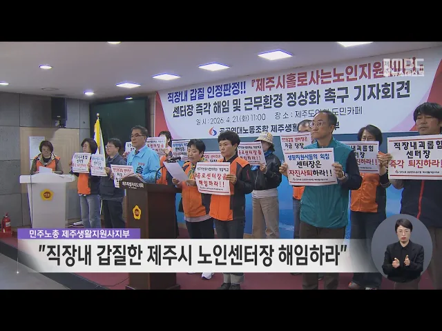 뉴스데스크 뉴스데스크뉴스투데이기획뉴스유튜브 뉴스페이스북 뉴스 prev 2026.4.21 - 화요일 next 햇빛소득마을 사업 본격 추진‥과제도 '산적' ◀ 앵 커 ▶마을 주민들이 태양광 발전사업을 하며수익을 나누는 '햇빛소득마을 사업'이제주에서도 본격적을 추진됩니다.이재명 대통령 공약 사업으로 올해만 전국적으로 500개 이상 마을을 선정할 계획인데... 박주연 위성곤 29일 국회의원직 사퇴‥서귀포 보궐선거 더불어민주당 제주도지사 후보로 선출된 위성곤 국회의원이 오는 29일 국회의원직을 사퇴하고 30일 도지사 예비후보로 등록하겠다고 밝혔습니다.위성곤 의원은 임기를 다 채우지 못한 점에 대해 서귀포 시... 조인호 제주도지사 후보들 공약 잇따라 더불어민주당 위성곤 제주도지사 후보는 도민들의 생생한 목소리를 듣겠다며도민경청본부를 만들어정책 제안과 도민불편 제안 창구인가칭 '소도리'를 운영하겠다고 공약했습니다.국민의힘 문성유 도지사 ... 권혁태 [기획]②수당보다 자립, 장애인 시설 밖의 삶 ◀ 앵 커 ▶지방선거 때마다 후보들은 장애인을 위해 지원 수당을 올리고, 복지관 시설을 개선하겠다는 등의 여러 공약을 내겁니다.하지만 정작 장애인들이 원하는 것은 현금이나 복지시설이 아니라 이웃과 ... 홍수현 현승준 교사 사망시건 제주중 교감 징계 확정 지난해 발생한 현승준 교사 사망사건과 관련해제주중학교 교감이 징계를 받았습니다.학교법인 제주 아남학원은 제주중학교 교감을 징계하라는 제주도교육청의 재심의 결과를 수용해교감에게 견책 처분을 ... 조인호 음식물 쓰레기 불법 매립‥"관리 감독 미흡" ◀ 앵 커 ▶개 농장에서 처리 비용을 벌기 위해 음식물 쓰레기를 불법으로 매립했다는 소식 잇따라 전해드렸는데요.개식용종식법이 시행되면서 예견됐던 일인데도행정당국의 준비가 미흡했다는 지적이 나오... 김항섭 제주대 양덕순 총장 취임 "지역과 성장하는 대학" 제주대학교 양덕순 총장 취임식이 열렸습니다.양덕순 총장은 취임사를 통해대학은 지성의 상아탑을 넘어교육과 연구, 산업과 정주가 하나로 이어지는지역 성장의 허브가 되어야 한다며, '다함께 제대로 새... 조인호 지방선거 후보자들에게 아동 공약 전달 6.3 지방선거에 출마하는 후보자들에게 아동 공약이 전달됐습니다.초록우산 아동권리옹호단 아동 대표 7명은오늘(21일) 제주도의회에서전국의 아동들이 제안한 건의 정책을 토대로 아동 정책 공약을 선정... 김찬년 "직장내 갑질한 제주시 노인센터장 해임하라" 민주노총 공공연대노조 제주생활지원사지부는제주도의회에서 기자회견을 갖고제주시 홀로 사는 노인지원센터장을해임하라고 요구했습니다.이들은 센터장이 생활관리사에게직장내 갑질을 했다고 노동청이 ... 조인호 '강제추행·음주운전' 물의 경찰관 파면 서귀포경찰서는 강제 추행과 음주운전으로 물의를 빚은 40대 순경을 파면했습니다.해당 순경은 지난 2월 제주시 연동의 한 유흥주점에서 여종업원을 추행한 혐의로 검찰에 송치돼 직위해제됐고지난 8일에... 조인호