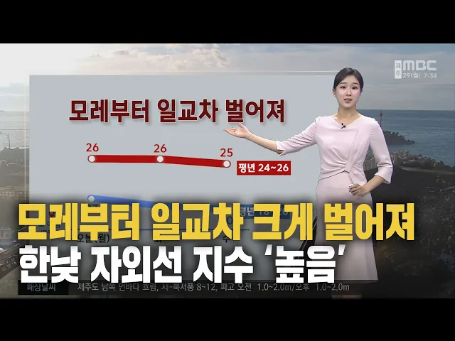 뉴스투데이 뉴스데스크뉴스투데이기획뉴스유튜브 뉴스페이스북 뉴스 prev 2025.9.29 - 월요일 next 일제강점기 사진엽서 특별전 개최 일제강점기 제주 풍경을 담은 사진엽서를 볼 수 있는 전시회가 열립니다. 제주도민속자연사박물관은 오늘부터 내년 1월 25일까지 광복 80주년 기념 특별전 '식민의 시선, 제주 풍경'을 마련합니다. 이번 ... 김항섭 추석 연휴 양지공원 특별 관리대책 시행 추석 연휴 기간 동안 양지공원에 3만 명이 넘는 추모객이 방문할 것으로 예상되면서 특별 관리대책이 시행됩니다. 제주도는 추석 연휴 기간 동안 양지공원 봉안시설 내 제례실을 폐쇄하고 추석 당일 화장... 김항섭 추석 연휴 앞두고 치안활동 강화 추석 연휴를 앞두고 치안활동이 강화됩니다. 제주경찰청은 오는 29일부터 추석 연휴가 끝나는 다음 달 12일까지 관광객이 밀집하는 장소와 번화가, 전통 시장에서 순찰을 늘리고 범죄 발생에 대비해 112상... 김항섭 추석 앞두고 신권 교환‥1인당 오만 원권 100만 원 한도 추석을 앞두고 신권 교환이 실시됩니다. 한국은행 제주본부는 다음달 2일까지 하루에 1인당 5만 원권과 만 원권을 각각 100만 원씩, 5천원 권은 50만 원, 천원권은 20만 원을 한도로 신권을 교환한다고 ... 박주연 제주, 흐림 속 자외선 지수 '높음' 완연한 가을 기운이 느껴지는 요즘입니다.현재 비구름대가 물러나면서 흐린 하늘이 드리워져 있는데요. 오늘은 종일 흐리겠지만, 낮 동안에는 햇살이 간간이 비치겠습니다.오늘 아침 기온 23도로 선선하게... 김희서