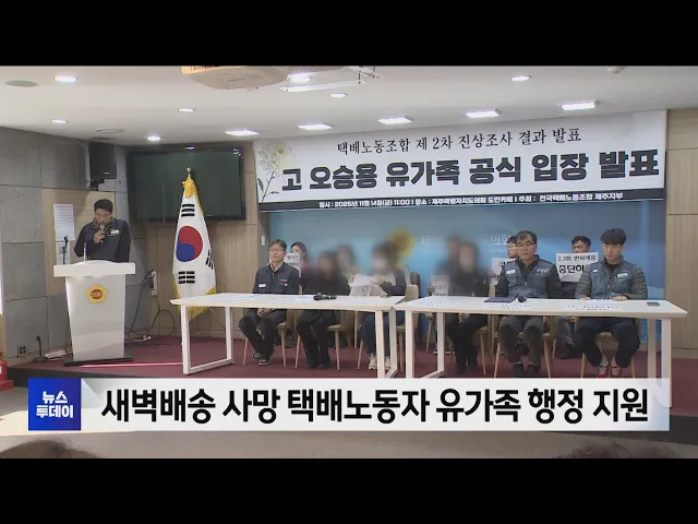 뉴스투데이 뉴스데스크뉴스투데이기획뉴스유튜브 뉴스페이스북 뉴스 prev 2025.11.24 - 월요일 next 오늘 흐린 가운데 포근‥내일부터 기온 뚝↓ 제주의 아침은 회색빛 하늘이 드리워져있습니다. 오늘은 종일 흐린 하늘 아래 다소 포근한 날씨가 이어지겠는데요.아침 최저 기온은 16도로 시작해 낮 최고 기온은 20도까지 오르며평년과 비슷하거나 조... 김희서 주거지원 사업 관련 예산 집행 저조 제주도의 주거지원 사업 관련 예산 집행이저조한 것으로 나타났습니다.제주도는 올해 2만 9천여 가구를 대상으로16개 주거지원을 사업을 시행하기 위해619억 원의 예산을 배정했는데,지난달까지 전체 예산... 김항섭 새벽배송 사망 택배노동자 유가족 행정지원 시작 제주도가 새벽 배송을 하다 숨진택배노동자 유가족에 대한행정지원을 시작했습니다.제주도는 유가족의 생계 안정과 자립을 위해긴급복지 생계지원금을 지원하고중장기적으로 필요한 복지 서비스를 연계할 ... 김항섭 학교별 4.3 교육과정 체계 수립 필요 제주 4.3 교육의 내실을 다지기 위해 학교별로 4.3 교육과정 체계를수립해야 한다는 주장이 나왔습니다.제주도의회에서 열린4.3 교육 현실과 과제 정책 토론회에서박진수 애월고 교사는 초등학교와 중학교... 김항섭 양식장 배출수 활용 전기 생산 시범사업 시작 양식장에서 버려지는배출수로 전기를 생산하는 시범 사업이 시작됩니다.제주도는 다음 달 서귀포시 대정읍의 한 양식장에서 배출수의 낙차를 활용해 발전기 터빈을 돌리는 50㎾급 소수력발전 설비를 설치... 이따끔