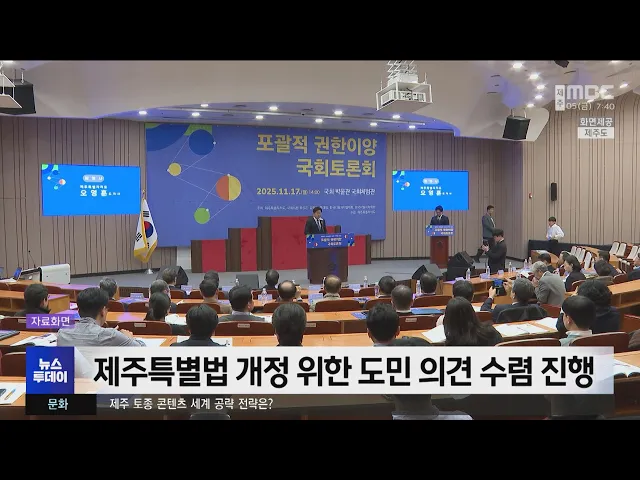 뉴스투데이 뉴스데스크뉴스투데이기획뉴스유튜브 뉴스페이스북 뉴스 prev 2025.12.5 - 금요일 next 자원순환시설 화재‥검은 연기 도심 뒤덮어 ◀ 앵 커 ▶어제(4일) 저녁 제주시내 한 자원순환시설에서 불이 나검은 연기가 도심을 뒤덮었습니다.다행히 큰 불길이 2시간 만에 잡히면서화재가 다른 건물로 번지지 않았지만,관할 소방서의 모든 인력과 ... 김항섭 준설공사 암석, 어장 투석 자재로 재활용 어항 준설공사에서 나온 암석을 마을어장 투석 자재로 재활용하는 방안이 추진됩니다.제주도는 그동안 대부분 육상으로 운반돼 매립재로 쓰이거나 버려지던 준설공사 암석을 전복과 해삼, 소라 등이 살 수... 홍수현 내일 오전까지 쌀쌀‥강풍·풍랑 유의! 새벽까지 내리던 비와 눈의 영향으로 오늘 아침, 도로 곳곳이 얼어 미끄럽겠습니다. 출근길 교통안전에 유의하셔야겠습니다.찬 공기가 머무는 가운데오늘 아침 기온은 9도로 어제보다는 높게 시작하고 있... 김희서 제주특별법 개정 위한 도민 의견 수렴 진행 제주도가 포괄적 권한이양 방식의 제주특별법 개정에 대해 도민 의견을 듣습니다.제주도는 제주관광공사에서 오는 10일은 포괄적 권한이양에 대한 토론회를, 15일에는 특별법 제도 개선안 도민 설명회를개... 홍수현 국비 확보 '해녀의 전당' 건립 사업 본격 추진 제주 해녀의 전당 건립 사업이 본격적으로 추진됩니다.제주도는 해녀의 전당 건립을 위한 국비 6억 5천만 원을 최종 확보하고,2029년 완공을 목표로 사업을 추진하기로 했습니다.해녀의 전당은 제주시 구... 홍수현