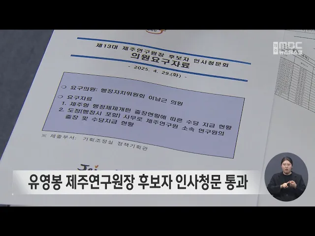 유영봉 제주연구원장 후보자가 도의회 인사청문회를 통과했습니다. 제주도의회 행정자치위원회는 유 후보자에 대한 인사청문회를 열고 현안해결 역량에 대한 우려가 있으나 위원회의 지적과 주문 사항들에 대해 적극 이행할 의지가 있는 것으로 판단해 적합 의견을 채택했다고 밝혔습니다. 도의회 인사청문보고서가 채택됨...