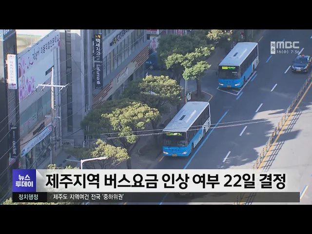 제주지역 버스 요금을 11년 만에 인상하는 방안이 오는 22일 결정될 전망입니다. 제주도 물가대책위원회는 오는 22일 전체회의를 열어 버스요금 인상안에 대해 심사하고 인상 폭과 인상 시기를 결정할 예정입니다. 제주도가 마련한 버스요금 인상안은 현행 천200원에서 15% 증가한 천500원으로 올릴 계획입니다. 제주도는 ...