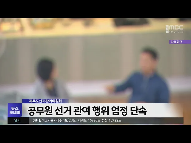 제주도선거관리위원회가 6월 3일 대통령선거와 관련해 공무원의 선거 관여 행위를 엄정 단속합니다. 이에 따라 공무원이 특정 정당과 후보자의 업적을 홍보하거나 지위를 이용한 선거운동 기획 참여 등 불법 선거 관여행위에 대한 단속 활동을 강화합니다. 또 이번 대선에서 공무원의 중립을 지켜줄 것을 자치단체와 교육청...