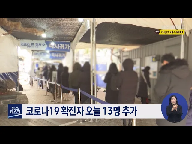 제주에서는 오늘 오후 5시 기준 코로나19 확진자 13명이 추가로 발생했습니다. 이 가운데 6명은 도내 확진자의 접촉자이고, 4명은 다른 지역 확진자의 접촉자, 2명은 감염 경로를 확인중이며 해외입국자 1명은 오미크론 감염으로 확인돼 누적 감염자는 19명입니다. 제주도 전체 인구 대비 2차 접종률 82.8% 3차 접종률은 38...