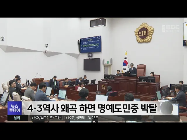 제주4·3에 대한 역사왜곡을 할 경우 명예도민증을 박탈할 수 있도록 한 조례 개정안이 도의회를 통과했습니다. 제주도의회는 본회의에 상정된 명예도민증 조례 개정안을 재석의원 43명 중 찬성 30명, 반대 12명, 기권 1명으로 가결했습니다. 표결 결과 더불어민주당 도의원들은 전원 찬성했고 국민의힘 도의원들은 모두 반...