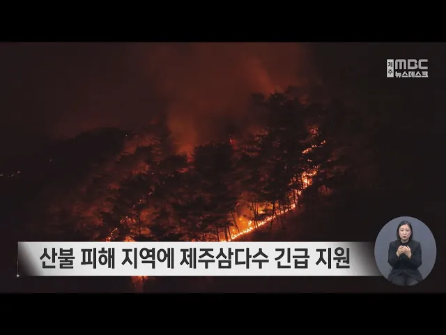 제주개발공사가 산불 피해 지역에 제주삼다수를 긴급 지원했습니다. 제주개발공사는 경남 산청과 경북 의성, 울산 울주군 등 대형 산불 피해지역에 구호용 제주삼다수 0.5리터짜리 만 3천440병을 지난 주말에 긴급 지원했다고 밝혔습니다. 또 오늘(24일)도 울산 울주군에 2천240병을 추가로 지원하고 앞으로도 구호용 먹는...