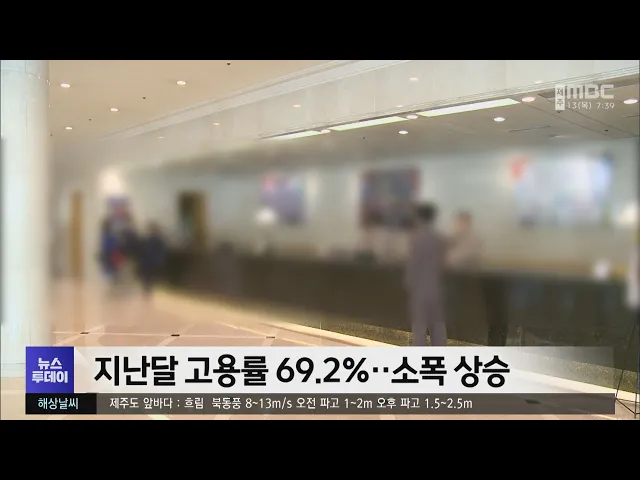 지난달 제주지역 고용률이 소폭 상승했습니다. 통계청 제주사무소가 발표한 제주도 고용동향에 따르면 지난달 취업자 수는 39만 9천 명으로 1년 전보다 천 명 늘었고 고용률은 0.4%포인트 상승한 69.2%를 기록했습니다. 산업별로는 사업·개인·공공서비스업에서 만 명 늘고 전기·운수·통신 등에서 2천 명 증가한 반면 건설업...