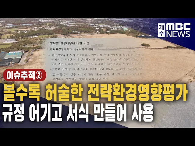 ◀ 앵 커 ▶ 대규모 개발을 추진할 때 초기 단계에서 계획이 타당한지 검토해 사업 추진 여부를 결정하는 제도가 전략환경영향평가인데요. 관련 법에는 심도 있는 논의를 위해 대면 심의를 하도록 규정하고 있으나 제주도는 서면 심의로 진행해 법 위반 논란과 함께 공정성 시비가 불거지고 있습니다. 송원일 기자가 취재했습...