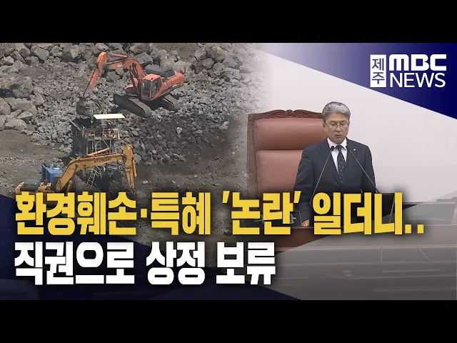 ◀ 앵 커 ▶ 중산간 개발 기준을 바꾸려는 제주도의 지구단위계획구역 변경안을 놓고 환경훼손 논란과 특혜 의혹이 커지고 있는데요. 도의회 본회의 표결을 앞두고 이상봉 의장이 심도 있는 검토가 필요하다며 직권으로 상정 보류를 결정했습니다. 송원일 기자가 보도합니다. ◀ 리포트 ▶ 무분별한 난개발을 막기 위해 도입된 ...