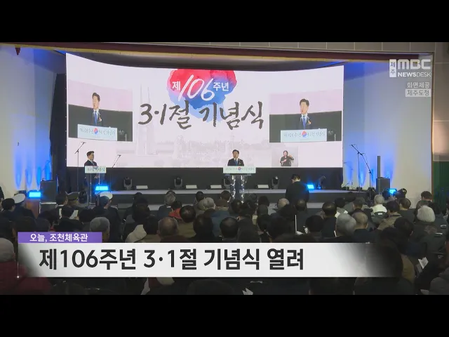106주년을 맞은 3.1절 기념식이 조천체육관에서 열렸습니다. 광복회원과 도민 등 천여 명이 참석한 오늘 기념식에서 오영훈 지사는 기념사를 통해 민주주의가 위협받는 상황에서 맞이하는 이번 3․1절은 그 의미가 더욱 절실하다며 헌법가치를 수호하고 자주독립 정신을 계승하자고 강조했습니다. 기념식에 앞서 참가자들은 ...