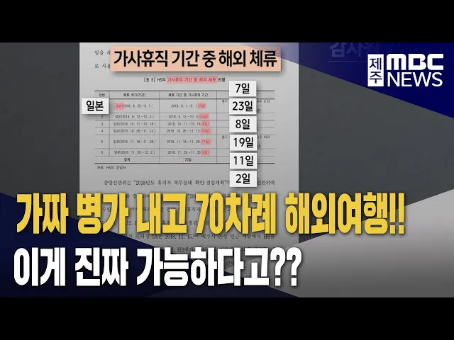 ◀ 앵 커 ▶ 허위로 병가를 낸 뒤 수십 차례 해외여행을 하고 근무한 것처럼 속여 수 천만 원의 수당을 챙긴 선관위 직원이 감사원 감사에서 적발됐습니다. 허술한 근무 관리제도 때문에 벌어진 일인데 보완이 시급합니다. 송원일 기자가 보도합니다. ◀ 리포트 ▶ 지난 2016년부터 7년 넘게 제주지역 선거관리위원회에서 간부...