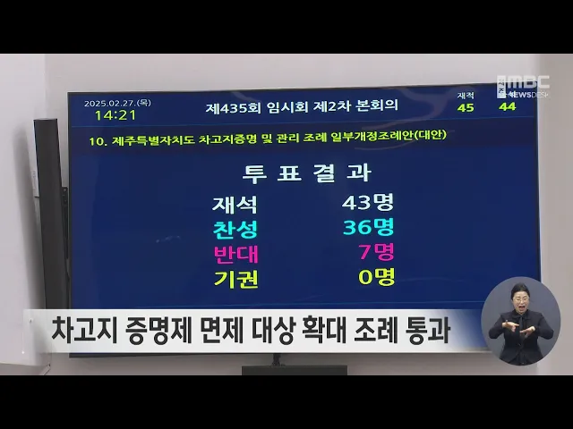 차고지 증명제 면제 대상을 확대하는 조례 개정안이 도의회를 통과했습니다. 이에 따라 다음달 말부터 천600cc 미만 차량과 전기차 등은 차고지 증명제 대상에서 제외됩니다. 한편 이상봉 의장은 폐회사를 통해 한달도 남지 않은 들불축제 프로그램이 대폭 변경돼 행정의 신뢰가 떨어지고 평화대공원 내 스포츠타운 조성도 ...