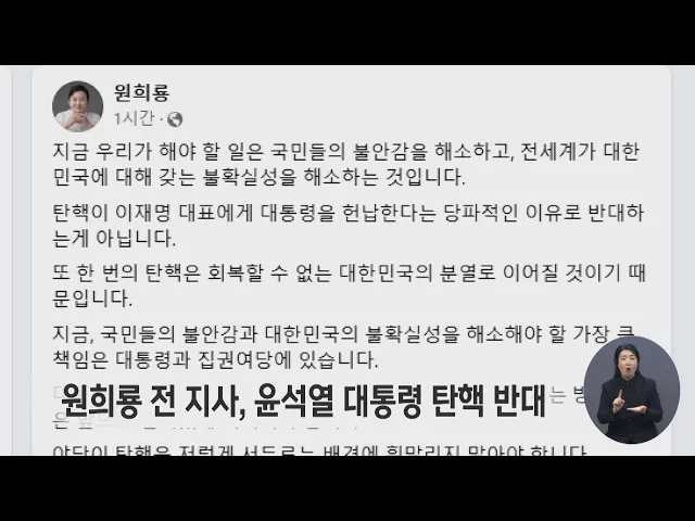 원희룡 전 제주도지사가 윤석열 대통령 탄핵에 반대하며 옹호에 나섰습니다. 원 전 지사는 자신의 SNS에 올린 글에서 지금 정부와 여당이 최우선적으로 해야 할 일은 혼란을 빨리 해소하는 것이라며 여당에게 분열은 무책임이라고 밝혔습니다. 특히 대통령 탈당 요구 같은 경솔한 언동은 도움이 되지 않을 것이라며 하나로 ...