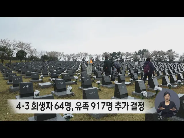 4.3 희생자와 유족 981명이 추가로 결정됐습니다. 제주도에 따르면 국무총리가 위원장인 제주4.3사건 진상규명과 명예회복 위원회는 제35차 회의를 열고 4.3희생자 64명과 유족 917명 등 모두 981명을 결정했습니다. 이번에 결정된 희생자 64명은 사망자가 30명, 행방불명자 14명, 후유장애인 1명, 수형인 19명입니다. 이번...
