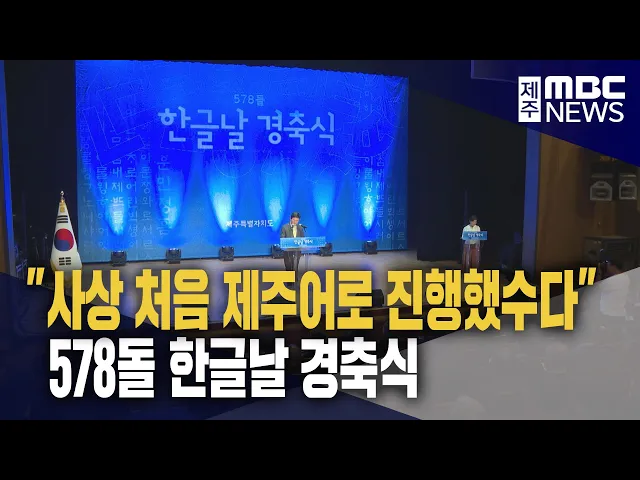 ◀ 앵 커 ▶ 오늘은 578돌을 맞는 한글날입니다. 한글날을 맞아 소멸 위기 언어인 제주어를 지키기 위해 국가 공식 행사인 한글날 경축식이 사상 처음 제주어로 진행됐는데요. 사라져 가는 제주어를 앞으로 더 자주, 더 많이 쓰는 계기가 될지 주목됩니다. 송원일 기자가 보도합니다. ◀ 리포트 ▶ ◀ SYNC ▶동광초 어린이 제주...