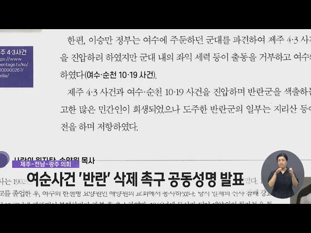제주도의회는 전남도의회, 광주시의회와 함께 한국사 교과서의 여순사건 '반란' 표현 삭제를 촉구하는 공동성명을 발표했습니다. 특히 여순사건은 한국전쟁 발발 직후 혼란한 시기에 국가폭력에 의해 무고한 민간인이 학살당한 비극인데도 일방적으로 '반란'이라고 규정하는 것은 역사 왜곡이라고 밝혔습니다. 이번 공동성...