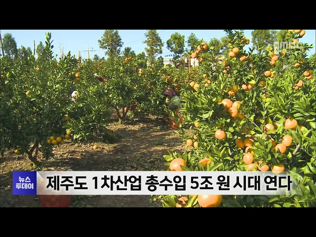 제주도의 1차산업 총수입이 5조 원 시대를 앞두고 있습니다. 제주도에 따르면 지난해 제주지역 농수축산업 총수입은 재작년보다 6.6% 늘어난 4조 8천873억 원을 기록했습니다. 분야별로는 감귤이 27% 증가해 역대 최고인 1조 3천248억 원을 기록했고 밭작물 8천462억 원, 수산업 1조 3천813억 원으로 증가세를 보였습니다...