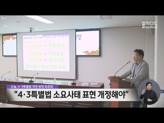 제주4·3의 올바른 이름을 찾기 위해서는 현재 4·3특별법 제2조 '정의' 조항을 개정해야 한다는 주장이 나왔습니다. 새로 출범하는 22대 국회에서 제주4·3특별법 개정 방향을 모색하기 위한 토론회에서 고성만 제주대 사회학과 교수는 4·3을 정의하면서 '4월 3일 발생한 소요사태'라고 표현한 내용을 개정해야 한다고 말했습...