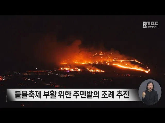 제주들불축제의 오름 불놓기를 부활하기 위해 주민들이 직접 조례 제정에 나섰습니다. 제주시 애월읍 주민들은 '정월대보름 들불축제 지원 조례'를 주민 발의로 제정하겠다며, 다음달 말까지 주민청구 기준인 천35명의 서명을 받은 뒤 도의회에 관련 조례안을 제출하겠다고 밝혔습니다. 그러나 오름 불놓기를 폐지하고 이를...