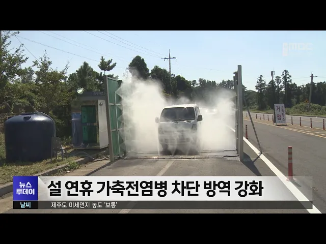 제주시는 설 연휴 사람과 차량의 이동이 늘어나 악성 가축전염병 유입 가능성이 높음에 따라 차단방역을 강화합니다. 이에 따라 설 연휴 특별방역대책 상황실을 24시간 운영하고 가축질병 유입을 차단하기 위해 지역 거점 소독시설 5곳을24시간 특별 운영합니다. 또 특별교부세 1억 원을 확보해 소독약을 포함한 방역약품...