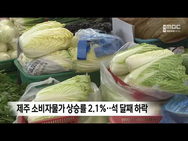 제주지역 소비자물가 상승률이 석 달째 하락세를 보였습니다. 통계청이 발표한 소비자물가 동향에 따르면 지난달 제주지역 소비자물가 상승률은 2.1%로 지난해 10월 이후 하락세를 이어갔습니다.품목별로는 축산물과 석유 가격이 4에서 6% 떨어졌지만 농산물이 15% 오르고 전기와 가스 요금도 4% 이상 올랐습니다.특히 신선...