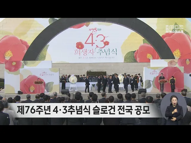 제주도는 내년에 열리는 76주년 4.3희생자추념식의 슬로건을 공모합니다.슬로건에는 4·3의 아픔을 평화와 인권, 화해와 상생의 가치로 승화하고 모든 세대가 공감하고 기억할 수 있는 내용이 함축적으로 표현돼야 합니다.공모 기간은 다음달 28일까지로 전 국민을 대상으로 진행하는데 당선작은 내년 1월 31일 발표합니다.