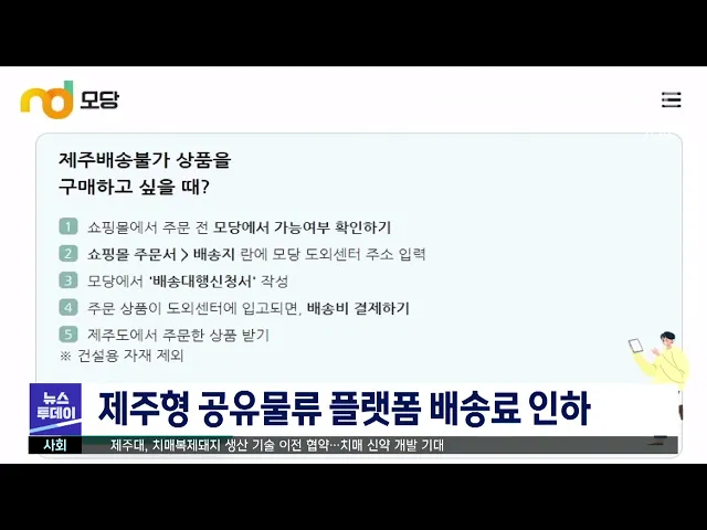 제주형 공유물류 플랫폼인 '모당' 배송료가 다음달부터 인하됩니다. 제주도는 다음달부터 가구류는 최대 62.5%, 식품류는 40%까지 배송료를 인하합니다. 지난 2월부터 운영에 들어간 '모당' 서비스는 상품배송처에서 제주거점센터까지 물품을 배송한 뒤 주문자가 직접 찾아가거나 추가 비용을 내고 자택 배송을 받는 시스...