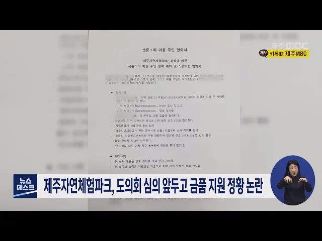 제주자연체험파크 개발사업 사업자가 마을 측에 금품 지원을 약속했다는 정황이 드러나 논란이 일고 있습니다. 제주시 조천읍 선흘1리 마을회 등에 따르면 사업자는 최근 마을에 10억 원을 지원하고, 공사장비 우선임대와 주민 우선 고용 등을 담은 협약서를 제안했습니다. 한편, 도의회 환경도시위원회는 내일(오늘) 자연...