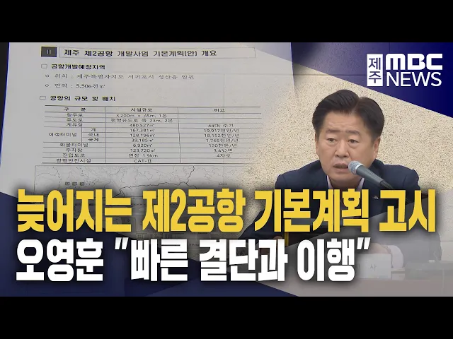 ◀ 앵 커 ▶ 제주 제2공항 건설을 공식화하는 정부의 기본계획 고시가 예상보다 늦어지면서 그 배경에 관심이 쏠리고 있는데요, 오영훈 제주도지사가 정부는 기본계획 고시를 더 이상 미루지 말라며 빠른 결단을 요구했습니다. ◀ 리포트 ▶ 제주 제2공항 기본계획의 핵심인 총사업비에 대한 국토교통...