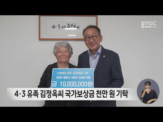 제주 4.3사건 희생자 유족인 제주시 한림읍 80살 김정옥 할머니가 국가보상금 천만 원을 4.3 평화재단에 기탁했습니다. 김정옥 할머니의 아버지인 고 김학수씨는 1948년 행방불명됐는데, 김 할머니는 아버지를 비롯한 4.3 희생자들을 기억하는 일과 다른 지방에서 수해를 입은 이들을 돕는 일에 보상금을 써달라고 부탁했...