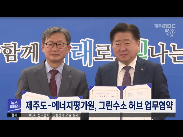 제주도와 한국에너지기술평가원이 그린수소 글로벌 허브 구축을 위한 업무협약을 맺었습니다. 두 기관은 수소경제 기반 구축을 위한 전략수립과 사업발굴, 제주도 수소산업 기본계획 수립 등에서 협력을 강화하게 됩니다. 제주도는 2천 26년까지 아시아 최대규모의 그린수소 생산시설을 구축하고 청소차 50여대와 수소버스...