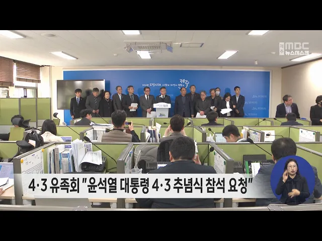 제주 4.3사건 희생자 유족회는 오늘, 제주도청에서 기자회견을 갖고 윤석열 대통령이 75주년 4.3 희생자 추념식에 첨석해달라고 요청했습니다. 이들은 희생자와 유족의 상처가 채 아물기도 전에 일부 인사들이 시대착오적 발언을 일삼아 제주 사회에 또다시 4.3 흔들기가 재현되지 않을까 하는 우려의 목소리가 나오고 있...
