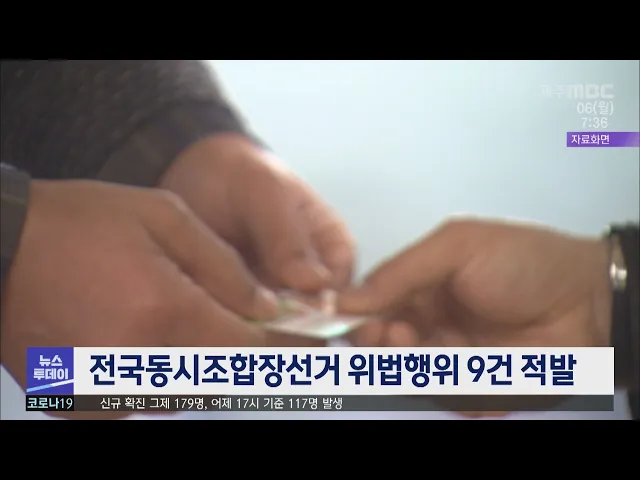 제주도선거관리위원회는 오는 8일 실시되는 전국동시조합장선거와 관련해 지금까지 위법행위 9건을 적발했다고 밝혔습니다. 이 가운데, 현직 조합장이 조합원에게 농산물을 제공한 사례 등 3건은 고발했고 1건은 수사의뢰, 5건은 경고했습니다. 이번 선거는 도내 농수축협 32군데의 조합원 6만 8천여명을 대상으로 오는 8...