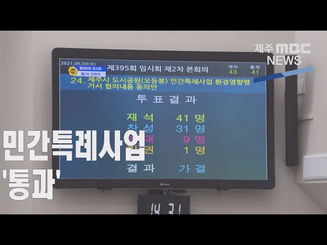 ◀ANC▶ 환경파괴와 특혜 논란이 일고 있는 도시공원 민간특례개발사업이마지막 관문인 도의회 동의절차를통과했습니다. 제주시는 곧바로 사업을 추진할 예정이지만 토지주들이 반발하고 있어 앞으로도 적지 않은 진통이 예상됩니다. 조인호 기자입니다. ◀END▶ ◀VCR▶ 제주시가 도시공원 민간특례개발사업을 추진한 ...
