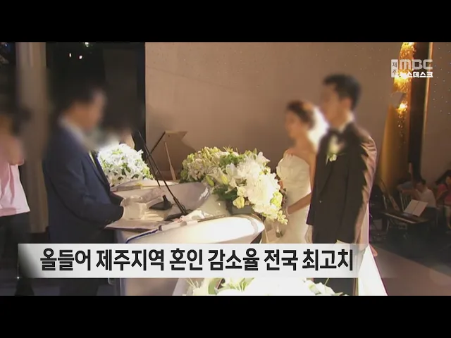 올들어 제주지역 혼인 감소율이 전국 최고치를 기록했습니다. 통계청에 따르면올들어 지난 9월까지 제주지역 혼인 건수는 천900여 건으로, 지난해 같은 기간보다 보다 4.9% 감소해전국 17개 시.도 가운데 가장 높은 혼인 감소율을 기록했습니다. 같은 기간 전국 혼인 건수는 14만 3천여 건으로 전년 대비 3.5% 늘었습니다....