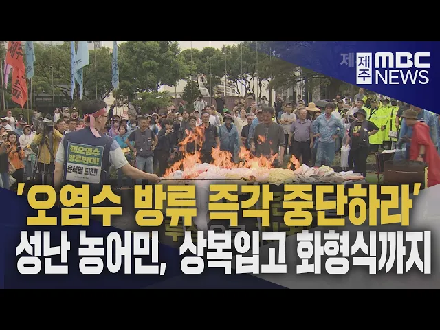 ◀ANC▶ 일본 원전오염수 방류가 시작되면서 농어민들의 걱정과 분노가 깊어지고 있습니다. 가장 먼저 오염수 유입이 예상되는 제주에서는 대규모 집회가 열렸습니다. 박주연 기자가 보도합니다. ◀END▶ ◀VCR▶ 핵 오염수라고 써 있는 드럼통에 담겨지는 제주산 수산물. 핵 오염수로 제주 바다가 오염돼 해녀와 어민 ...