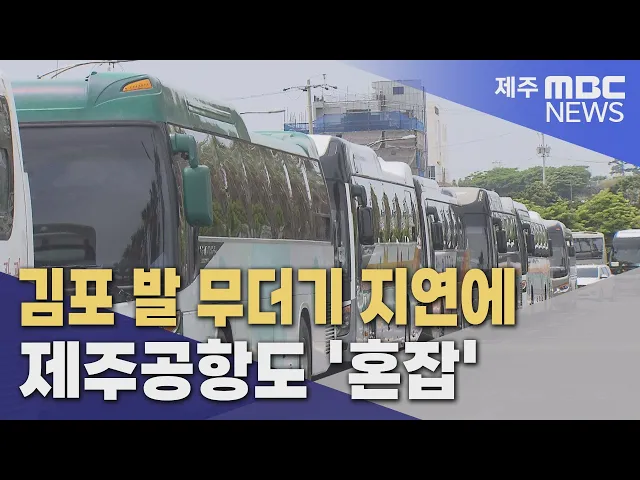 ◀ANC▶ 김포공항에서 위탁 수하물 처리가 늦어지면서 항공기 무더기 지연사태가 빚어졌는데요. 제주공항에서는 수학여행단 도착이 늦어지면서 교통 혼잡이 발생했고, 출발 항공편까지 줄줄이 지연됐습니다. 박주연 기자가 보도합니다. ◀END▶ ◀VCR▶ 제주공항 3층 앞 도로부터 1층 주차장 진입로까지 전세 버스가 길...