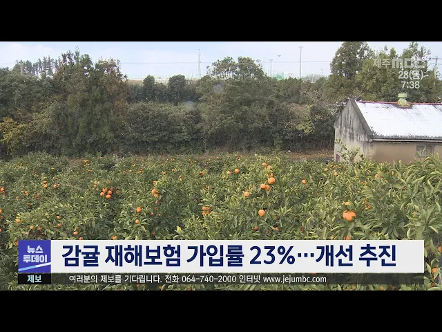 감귤 품목 농작물 재해보험 가입률이 저조한 것으로 나타났습니다. 제주도에 따르면 지난해 기준 감귤 재해보험 가입률은 23.5%로 전체 농작물 재해보험 가입률 49.7%에 비해 절반 수준에도 미치지 못했습니다. 제주도는 가입률을 높이기 위해 동상해 인정 기준을 확대하고, 온주 밀감과 민감류의 보험 기한도 12월과 다음...
