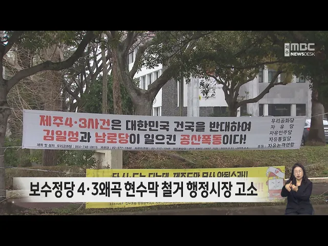 4.3왜곡 현수막 철거와 관련해 현수막 게시 당사자인 일부 보수정당이 제주시장과 서귀포시장을 고소했습니다. 우리공화당과 자유당, 자유민주당 등은 강병삼 제주시장과 이종우 서귀포시장, 현수막 철거 집행 공무원들을 특수재물 손괴와 정치활동 방해, 직권남용 혐의로 제주지방검찰청에 고소했습니다. 한편 지난 4일, ...