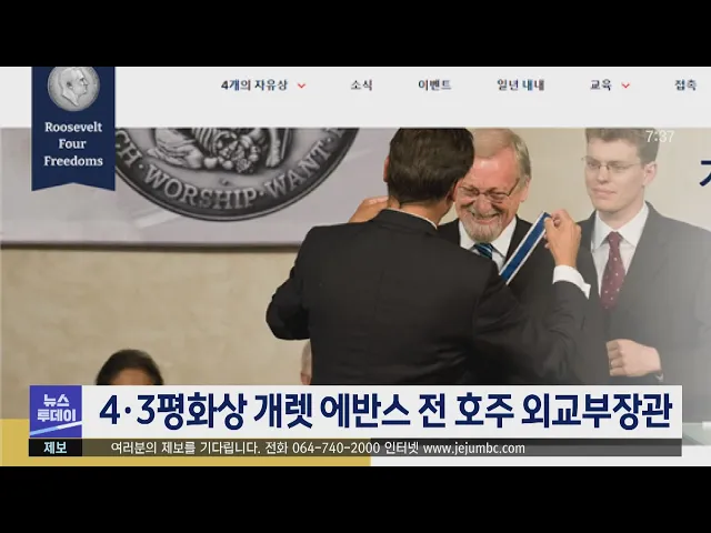 제5회 제주 4.3평화상에 개렛 에반스 전 호주 외교부장관이 선정됐습니다. 개렛 에반스 전 장관은 내전중이던 캄보디아의 평화를 정착시킨 파리 평화조약 체결에 기여하고, 국가 폭력에 의한 대량학살로 인한 민간인 보호를 위해 국제규범을 만드는 등 평화와 인권의 가치를 구현한 공로를 높게 평가받고 있습니다. 한편, ...