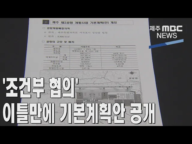 ◀ANC▶ 환경부의 제주제2공항 전략환경영향평가 조건부 협의 통보 이틀 만에 국토부가 기본계획안을 공개했습니다. 제주도는 내일(9일)부터 주민 의견 수렴 절차에 본격 착수하기로 했습니다. 박주연 기자가 보도합니다. ◀END▶ ◀VCR▶ 국토교통부가 전격적으로 제주도에 통보한 제주제2공항 기본계획안. (CG) 서귀...
