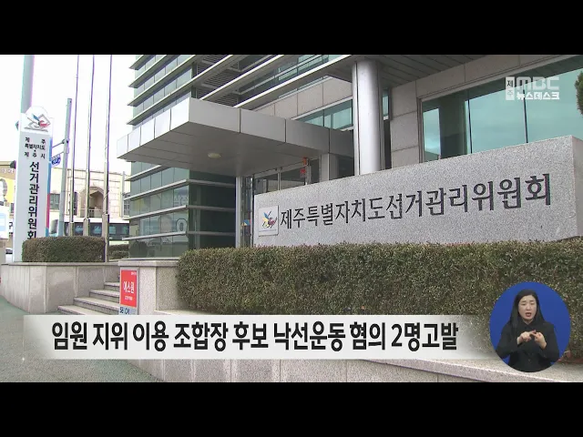 제주도선거관리위원회는 오는 8일 실시하는 전국 동시조합선거와 관련해 지위를 이용해 불법선거운동을 한 혐의로 모 조합의 임원 등 2명을 경찰에 고발 조치했다고 밝혔습니다. 이들은 모 조합의 임원으로서 지위를 이용해 SNS 단체 채팅방에서 글을 게시하는 방법으로 조합장선거 모 후보자에 대한 낙선 목적의 선거운동...