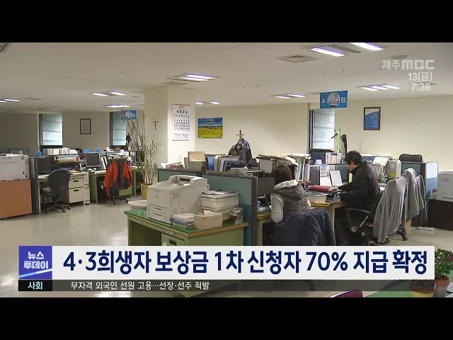 제주4.3사건 희생자 보상금 신청 6개월 만에 신청자의 70%가 보상금 지급 대상자로 확정됐습니다. 제주도는 지난해 12월까지 천368명에 대한 심의를 마무리하고 제주 4.3 실무위원회에 보상금 지급 대상자 결정 내용을 통보했다고 밝혔습니다. 지급 대상자로 결정된 희생자 가운데 천9명에게 625억 원의 보상금을 지급했고...