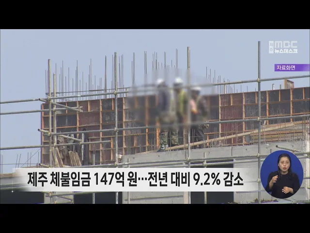 제주지역 노동자 체불임금 규모가 줄어든 것으로 나타났습니다. 제주도에 따르면 지난해 말 기준 도내 체불임금은 147억 원으로 1년 전보다 9.2% 감소했습니다. 아직 해결되지 못한 체불임금은 8억 600만 원입니다. 업종별로는 건설업이 43%로 가장 많고, 도.소매와 음식.숙박업이 17%로 뒤를 이었습니다.