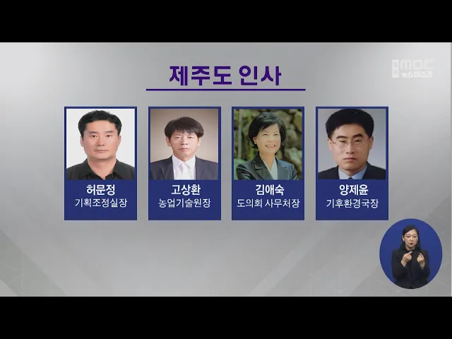 제주도가 오는 17일자로 올해 상반기 정기인사를 단행했습니다. 기획조정실장에 허문정, 농업기술원장에 고상환, 도의회 사무처장에 김애숙, 기후환경국장에는 양제윤씨를 발령했습니다. 또, 건설주택국장에 양창훤, 공항확충지원단장에 좌정규, 도시균형추진단장에 고성대, 관광교류국장에는 변덕승씨가 임명됐습니다. 농...