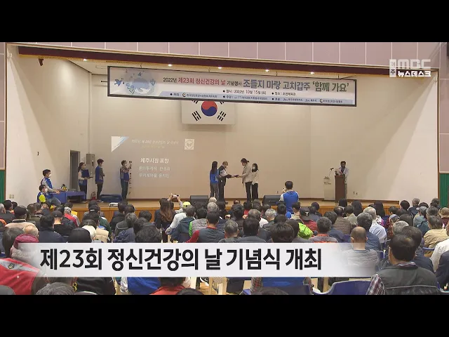 제23회 정신건강의 날 기념식이 조천체육관에서 열렸습니다. 한국정신요양시설협회 제주지회가 주최한 오늘 행사에서는 정신장애인 봉사활동에 공이 많은 자원봉사자와 단체들이 상을 받았고, 정신장애인 권리장전을 낭독했습니다. 장애인과 가족, 자원봉사자들은 어울림 한마당을 펼치면서 재활 의지를 다졌습니다.