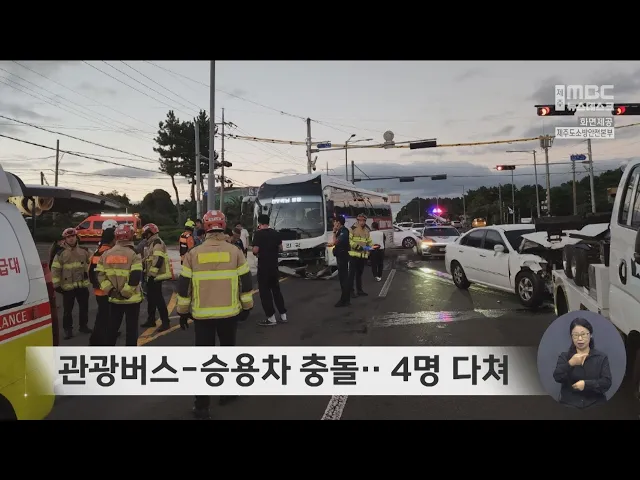 추석 연휴에 관광버스와 승용차가 충돌해 4명이 다치는 사고가 발생했습니다. 제주소방안전본부에 따르면 어제(7일) 오후 6시쯤 서귀포시 성산읍 신양교차로에서 20명이 탄 전세버스와 승용차가 부딪혀 승용차에 타고 있던 외국 국적 여성 1명과 버스 탑승객 3명 등 4명이 다쳐 병원으로 이송됐습니다. 경찰은 정확한 사...