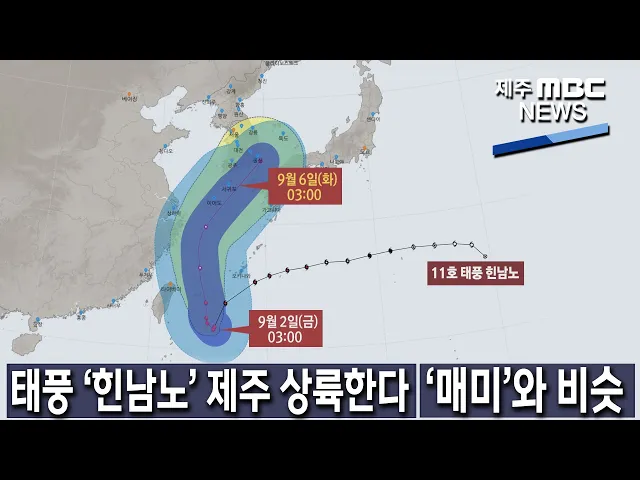◀ANC▶ 초강력 태풍 '힌남노'가 제주에 상륙할 가능성이 높아졌습니다. 태풍 힌남노는 지난 2천 3년 한반도를 강타했던 태풍 '매미'와 강도와 경로가 비슷하다는 관측이 나와 긴장감이 높아지고 있습니다. 박주연 기자가 보도합니다. ◀END▶ ◀VCR▶ 타이완 남동쪽 해상에서 남서진하고 있는 제 11호 태풍 힌남노. 위...